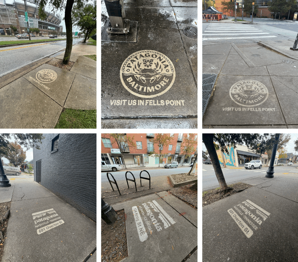 The spots went down in high-foot traffic areas near the stores. We tried to find the popular walking paths where there was the most accumulated dirt on the sidewalks. We love how we were able to translate the Patagonia branding into stencil format – whether it was their traditional logo or a more artistic interpretation of the brand.